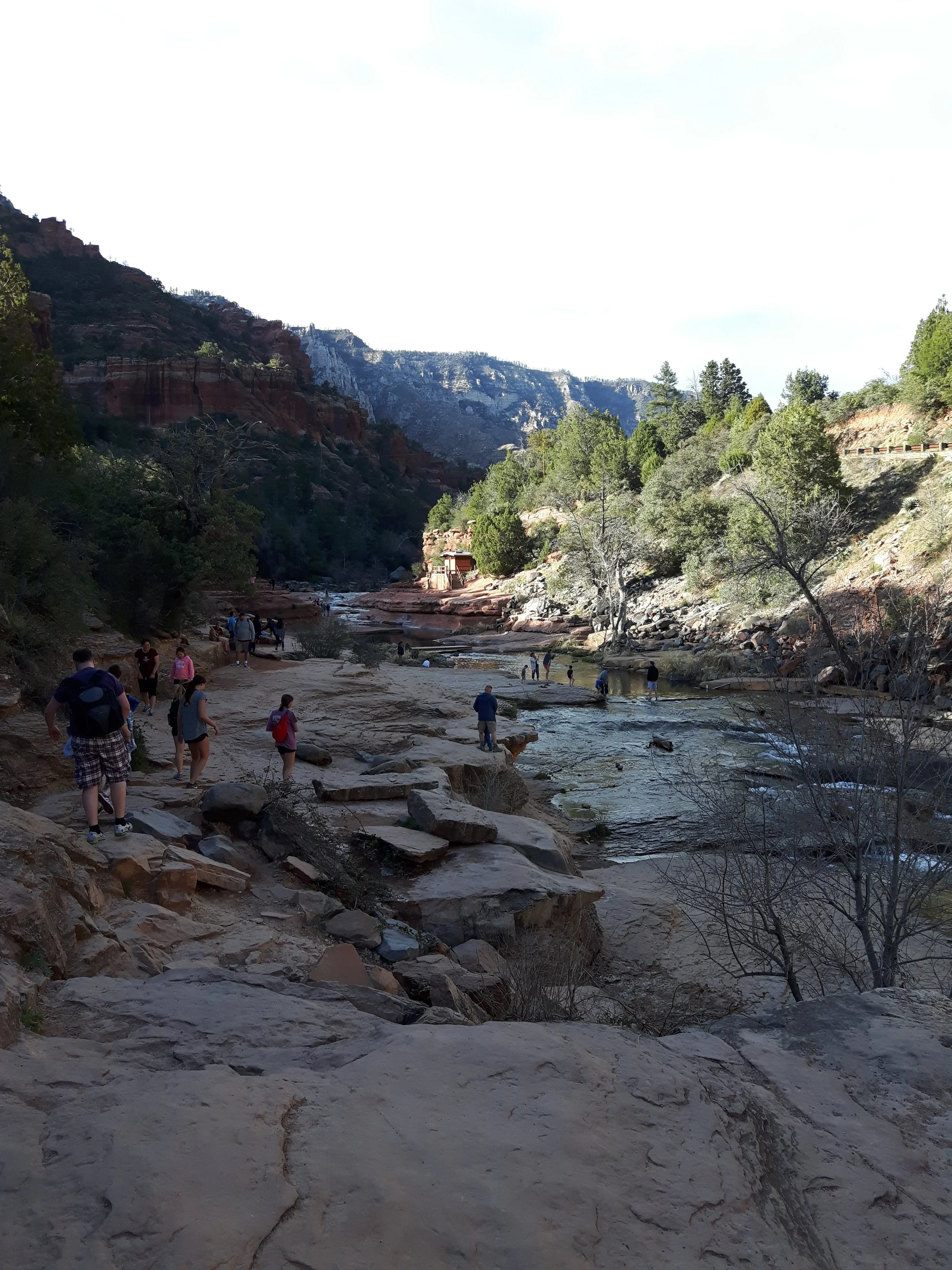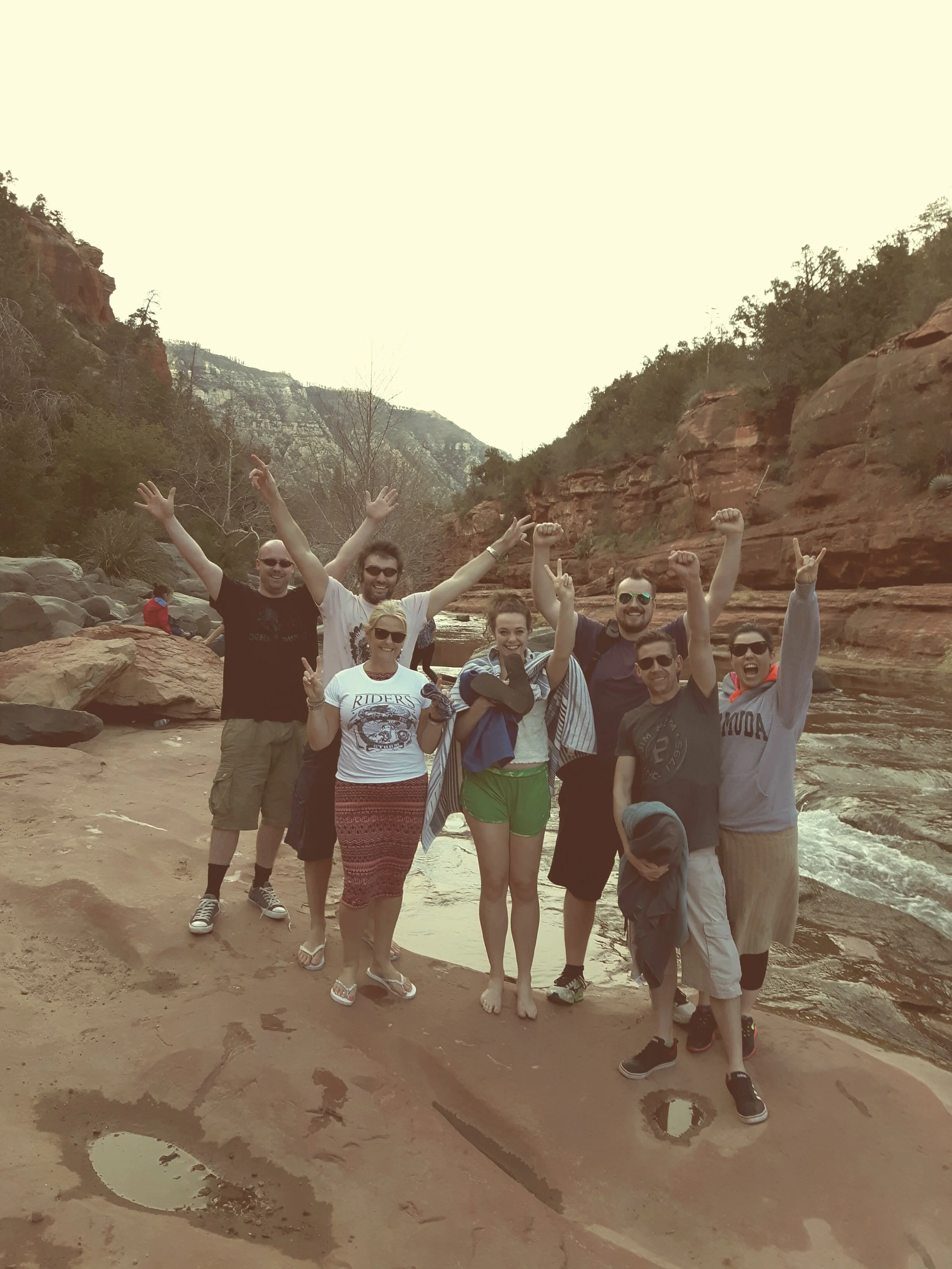 We stop at Slide Rock Park on recommendation of the band’s host back in Phoenix. He says you can actually get in the river and slide downstream because it’s so smooth. Our walk to the river is simply spectacular. I’m running out of superlatives to describe this landscape, which has a tinge of psychedelia about it with the blue backdrop of the sky, and the pockets of green around each cliff and hill that merges with the red and orange. It’s like the rainbow fell from the sky and sprayed the landscape as it hit the ground.